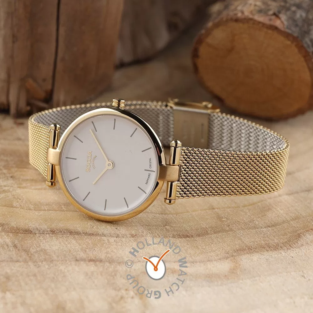 This Boccia watch has a case made of titanium with a diameter of 30 mm and is fitted with a titanium band. Inside the case lies a Miyota movement and the watch features a Sapphire crystal.