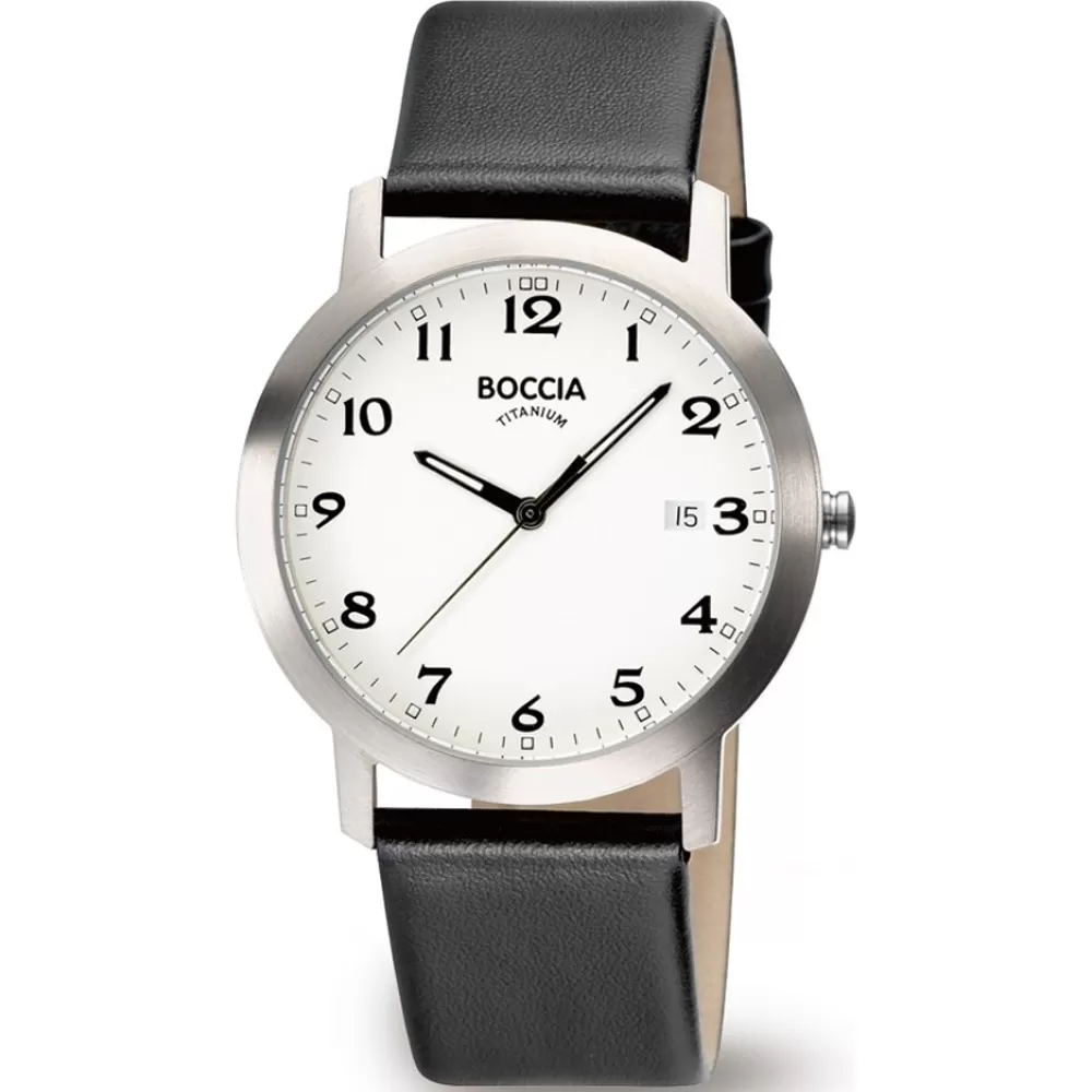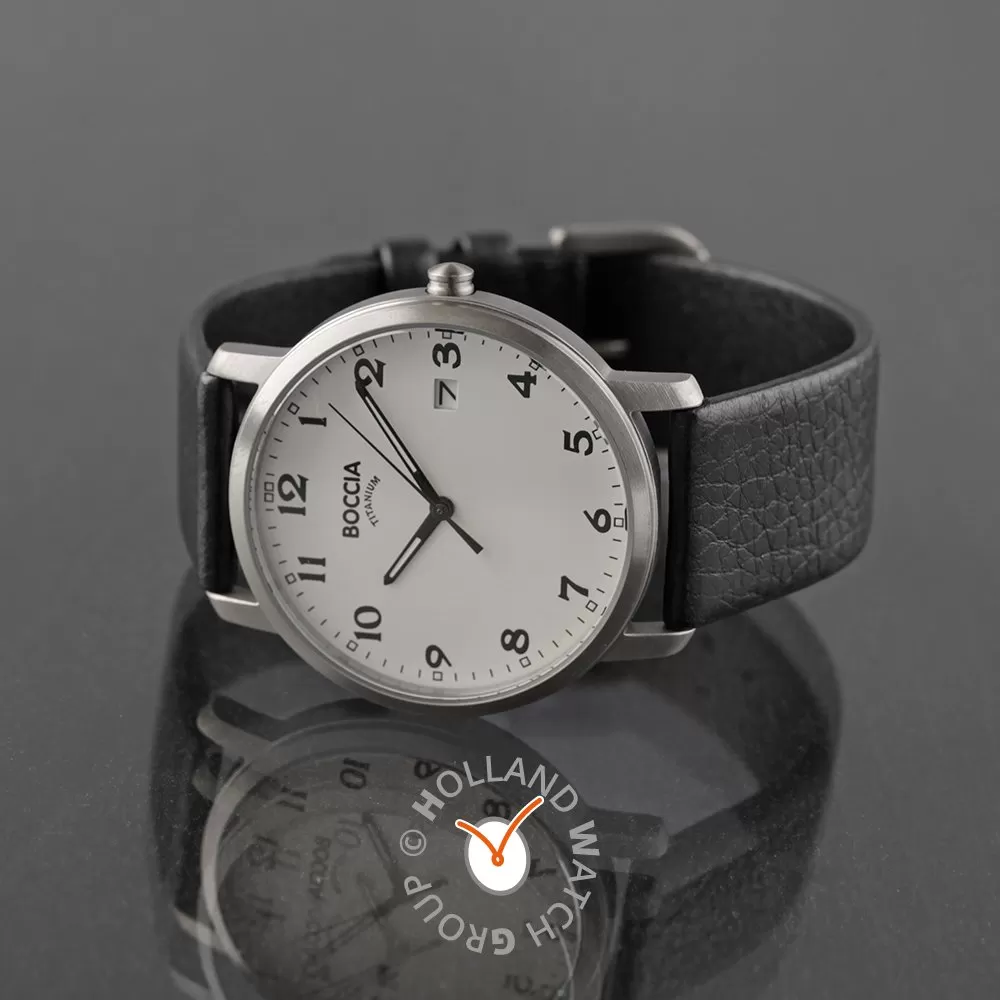 This Boccia watch has a case made of titanium with a diameter of 38 mm and is fitted with a leather band. Inside the case lies a Miyota movement and the watch features a Mineral crystal.