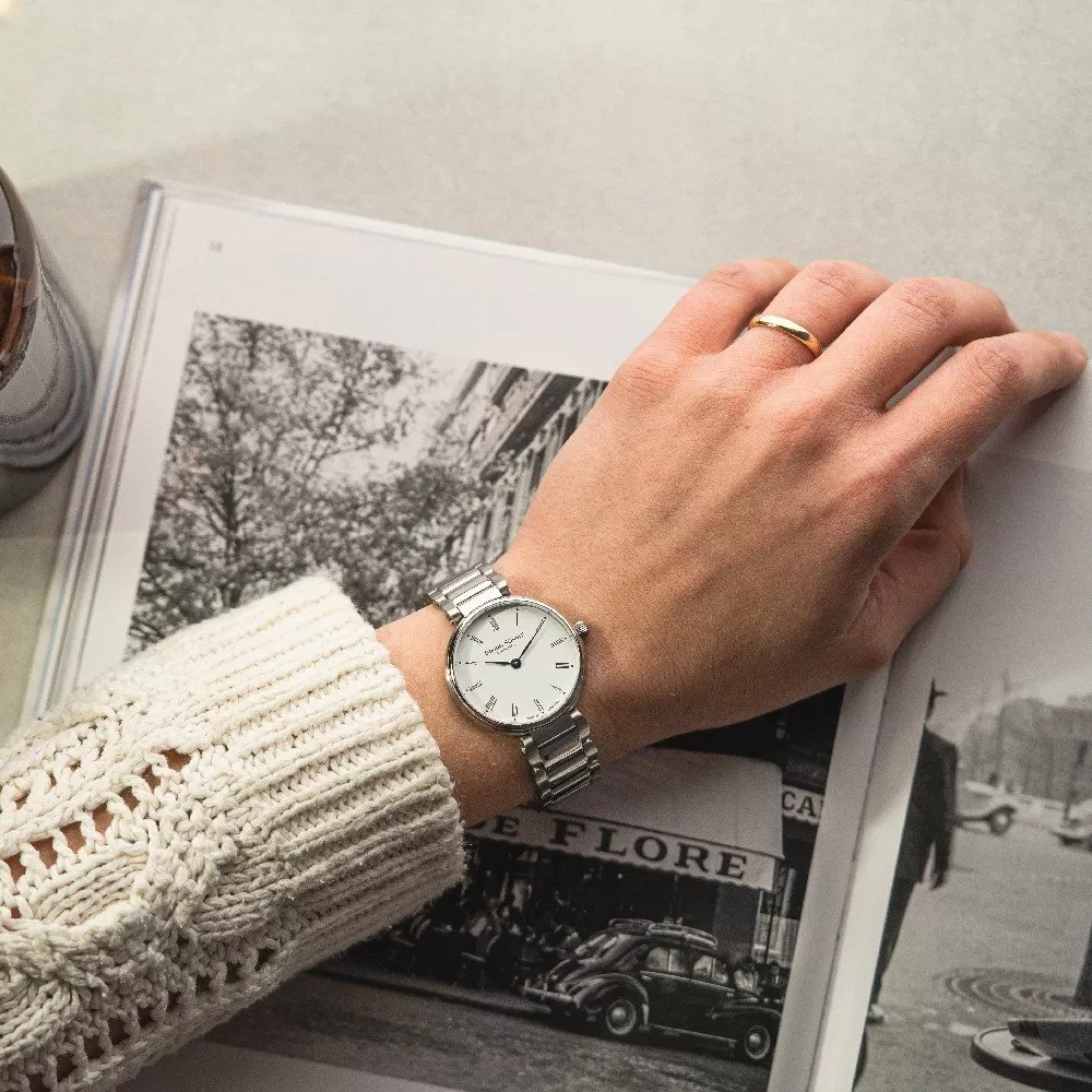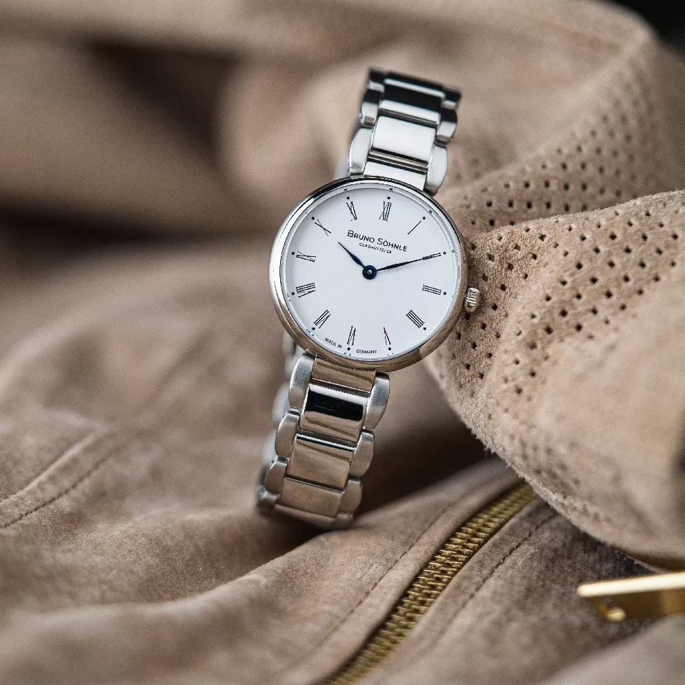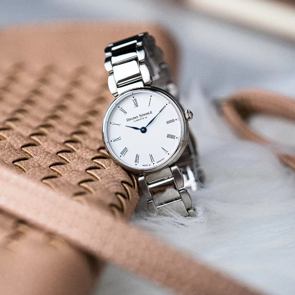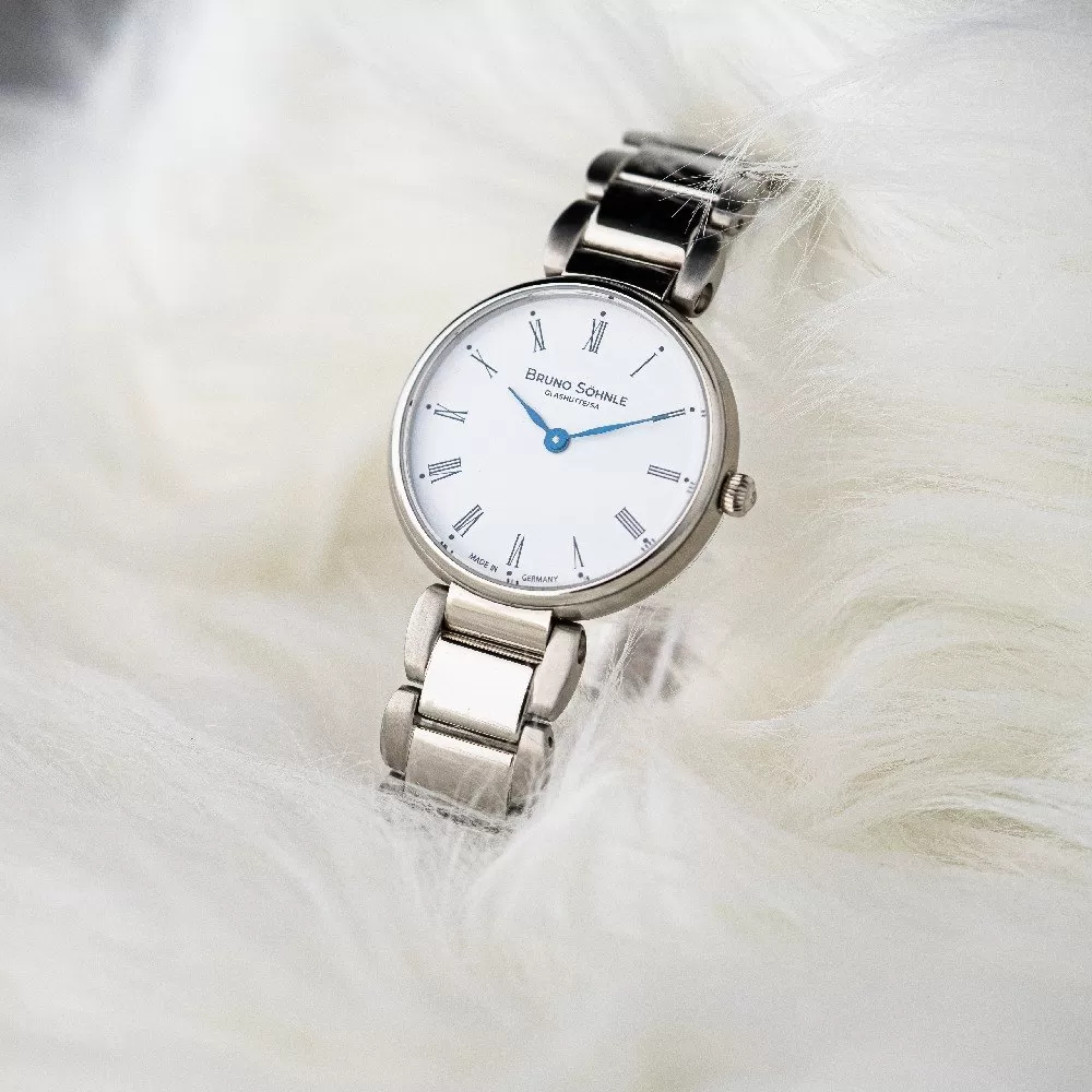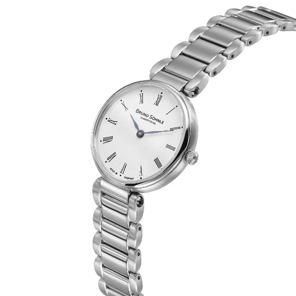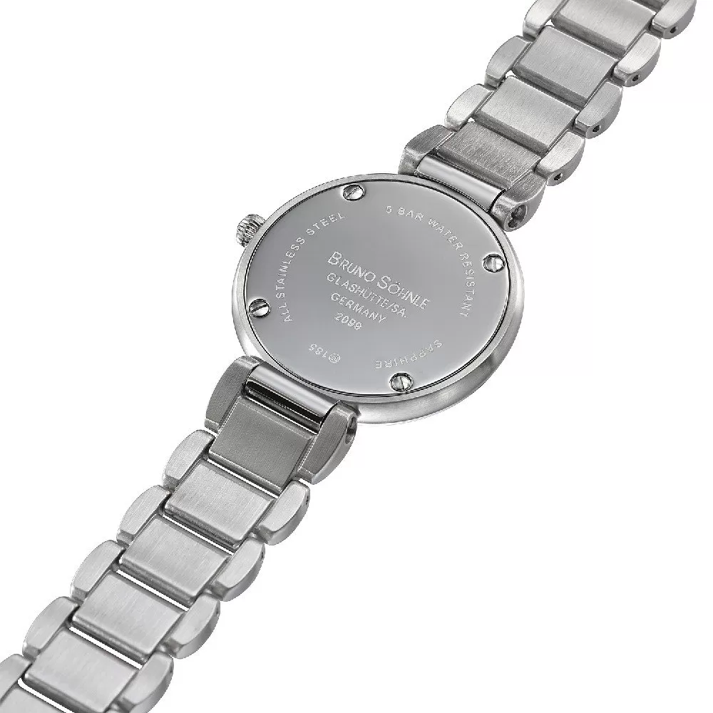 This Bruno Söhnle watch has a case made of stainless steel with a diameter of 33 mm and is fitted with a metal band. Inside the case lies a Ronda movement and the watch features a Single anti-reflective sapphire crystal.
