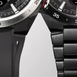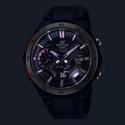 The design of the ECB-2200 is inspired by the air flow around a race car. The unique exterior is made up of an an intricately moulded case constructed of composite parts and a sharp, dimensional mechanical face, with a look of sheer speed. The chronograph features Smartphone Link connectivity and Tough Solar charging.
