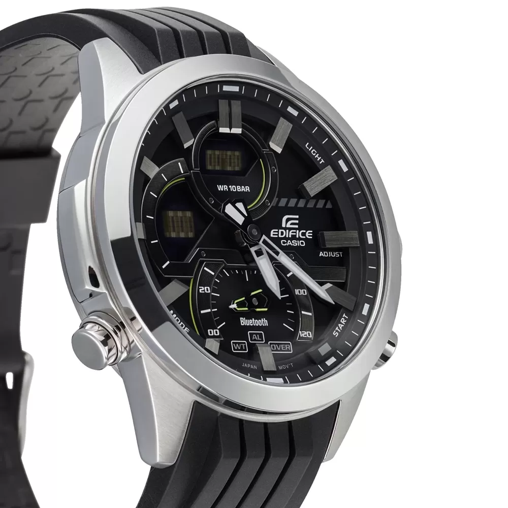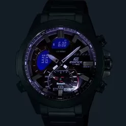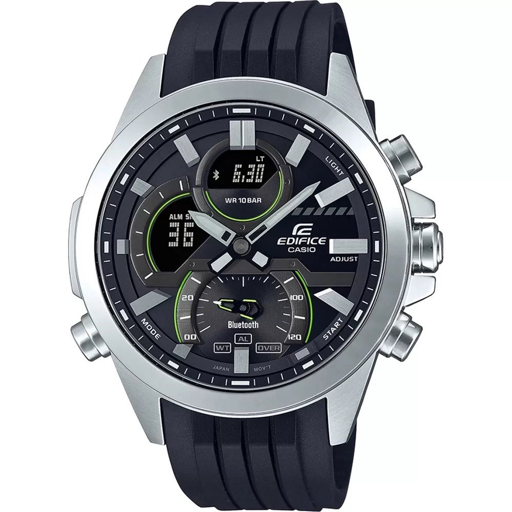 This Casio Edifice watch has a case made of stainless steel with a diameter of 46 mm and is fitted with a plastic / resin band. Inside the case lies a Casio movement and the watch features a Mineral crystal.
