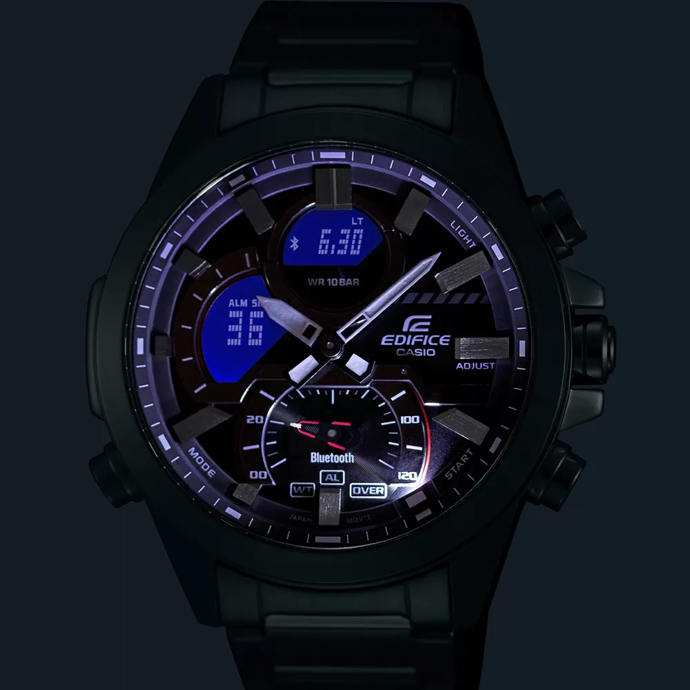 Sports car-inspired mechanical design: A high-performance digital-analogue timepiece with Smartphone Link. The stainless-steel exterior exudes strength and solidity. The mechanical face design evokes a sports car. Just sync with smartphone apps for intuitive control of a range of functions, from adjusting the time to managing schedules and even watching motorsports events.