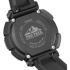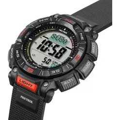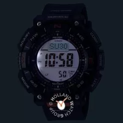 This digital Pro Trek features a duplex LCD with direct function buttons for one-push measurements. The rotating bezel, case, case back, and urethane band are made with plant-derived, renewable biomass plastics.