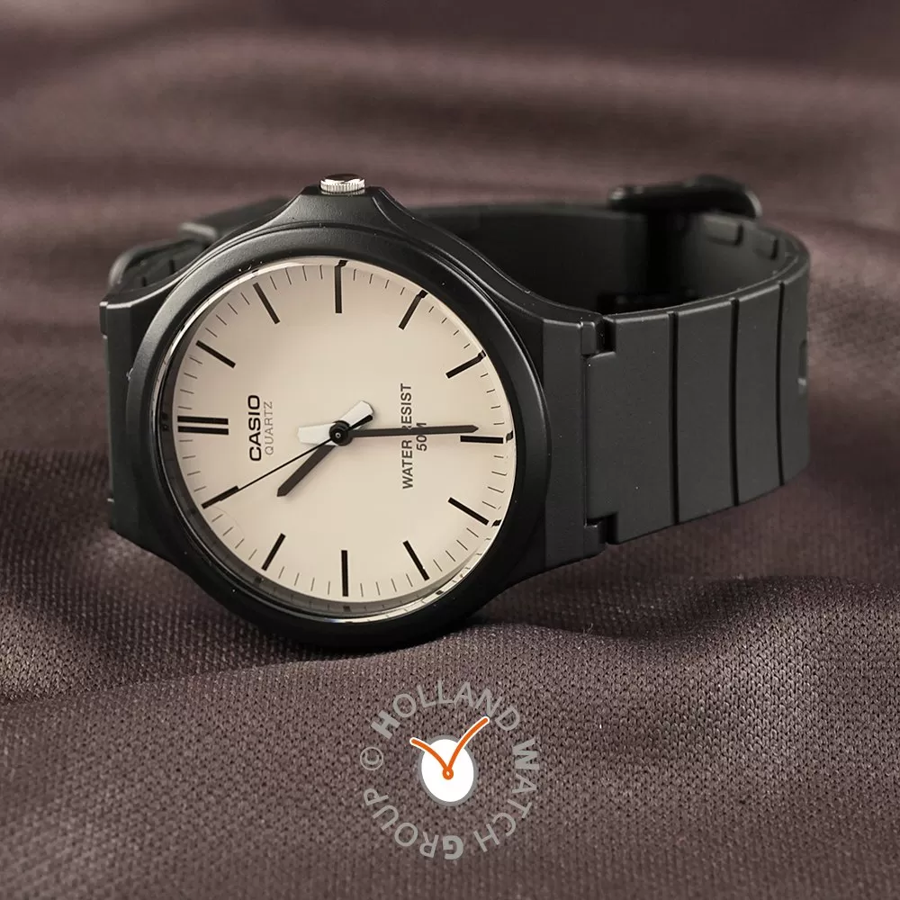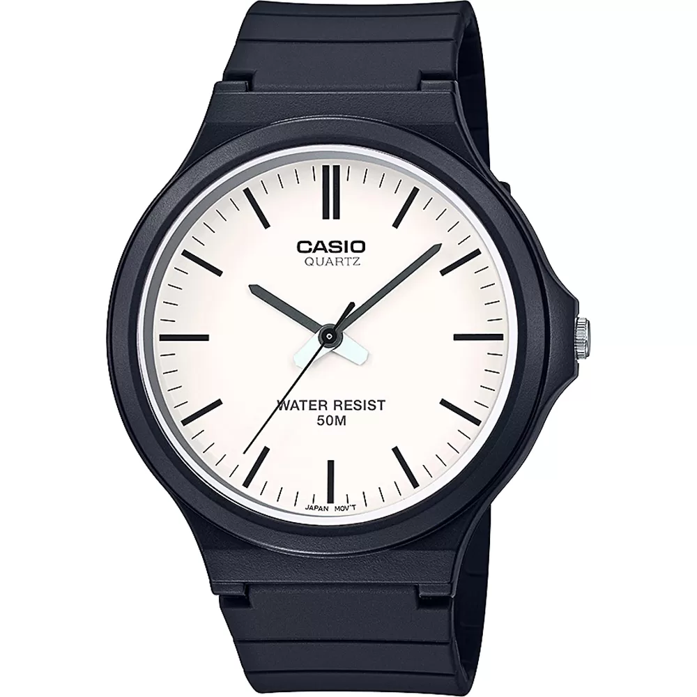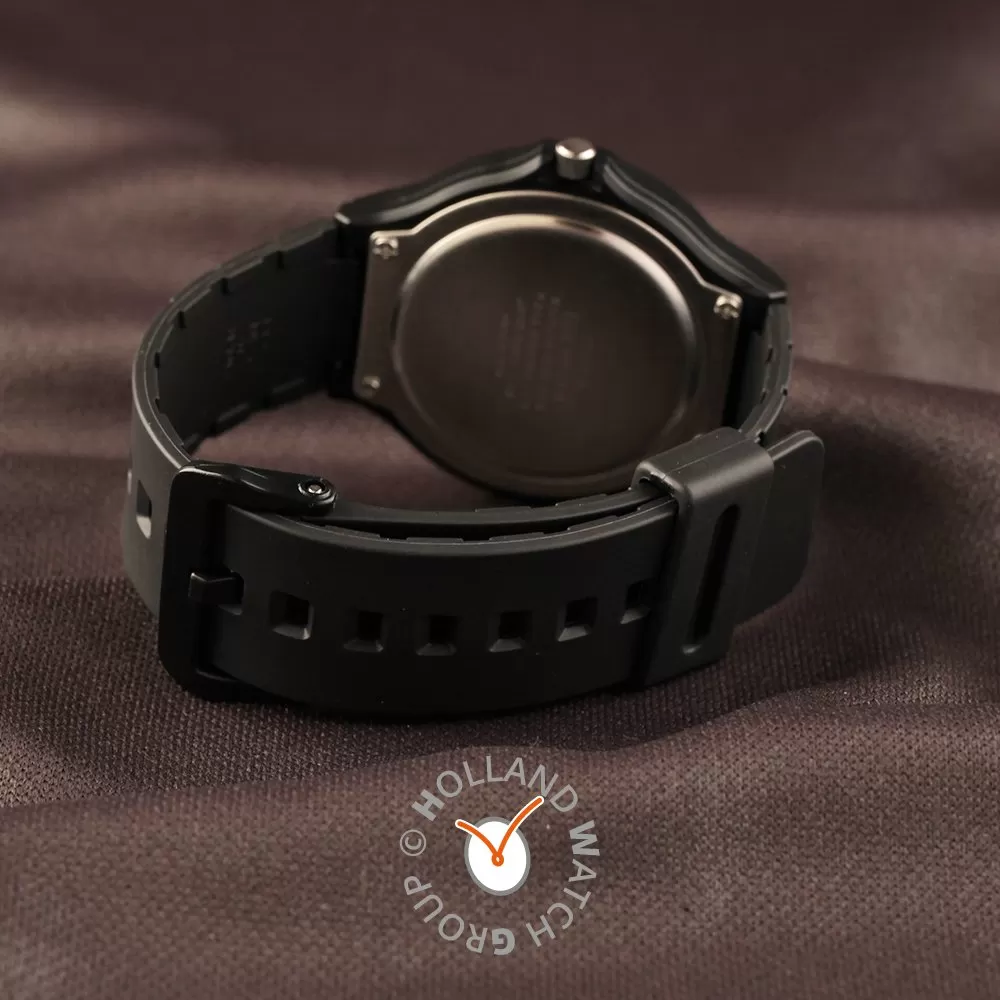 This Casio watch has a case made of plastic with a diameter of 43.6 mm and is fitted with a plastic / resin band. Inside the case lies a Casio movement and the watch features a Plexi crystal.