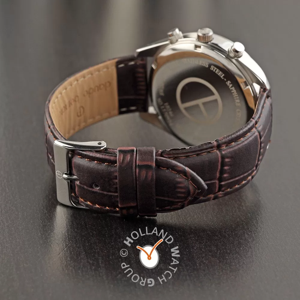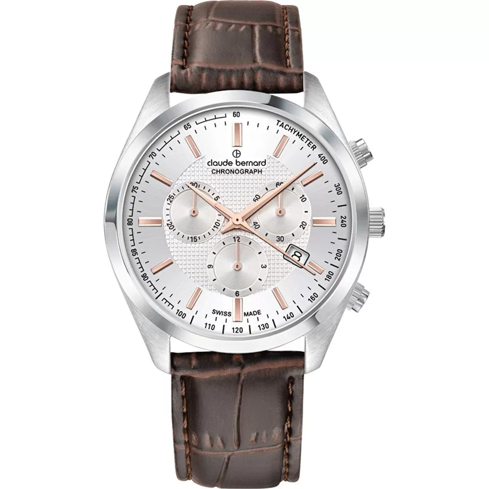 This Claude Bernard watch has a case made of stainless steel with a diameter of 42 mm and is fitted with a leather band. Inside the case lies a Ronda movement and the watch features a Sapphire crystal.