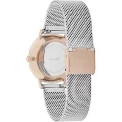 This Cluse watch has a case made of stainless steel with a diameter of 33 mm and is fitted with a metal band. Inside the case lies a Miyota movement and the watch features a Mineral crystal.