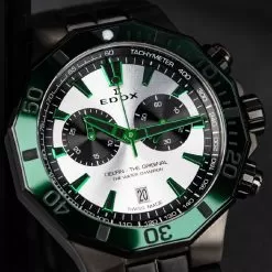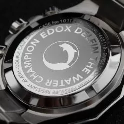 This Edox watch has a stainless steel case 43 mm in diameter and is fitted with a rubber strap. Inside the case lies a Ronda movement and the watch features a Sapphire crystal.