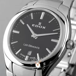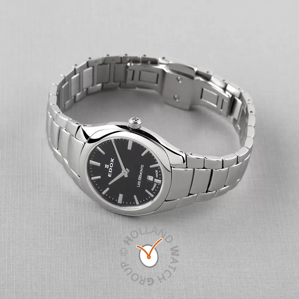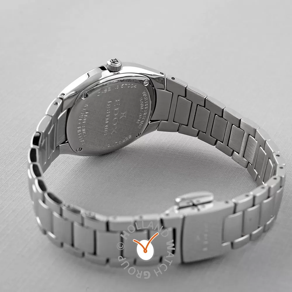 This Edox watch has a case made of stainless steel with a diameter of 30 mm and is fitted with a metal band. Inside the case lies a Ronda movement and the watch features a Sapphire crystal.