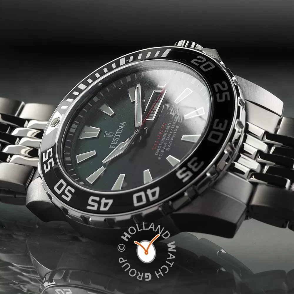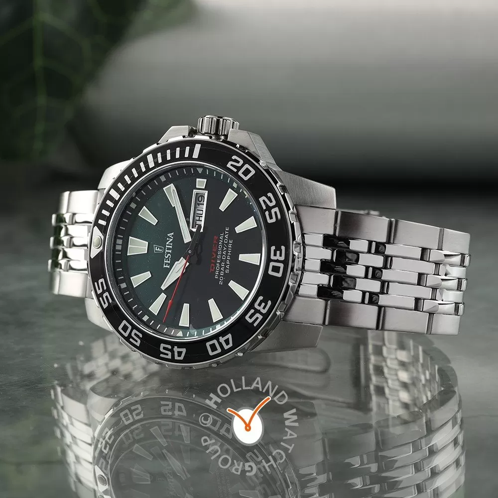 This Festina watch has a case made of stainless steel with a diameter of 45 mm and is fitted with a metal band. Inside the case lies a Miyota movement and the watch features a Sapphire crystal.