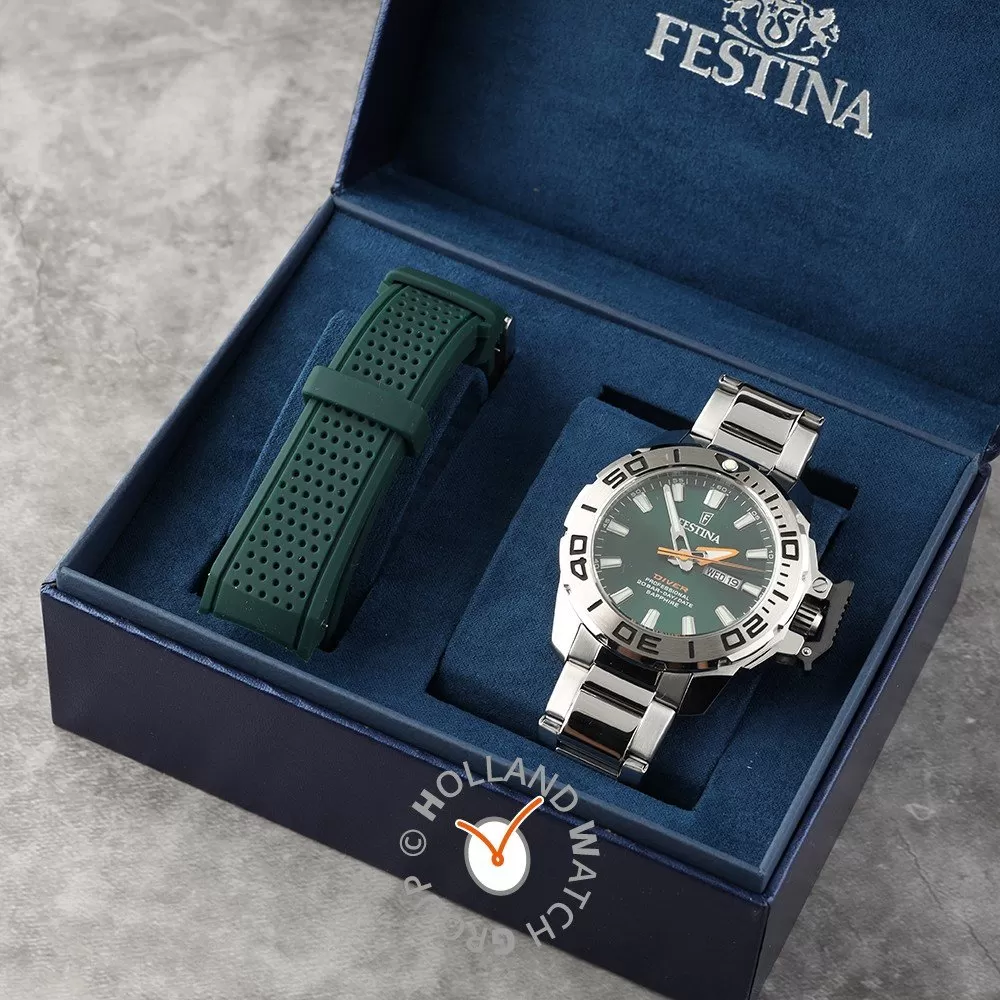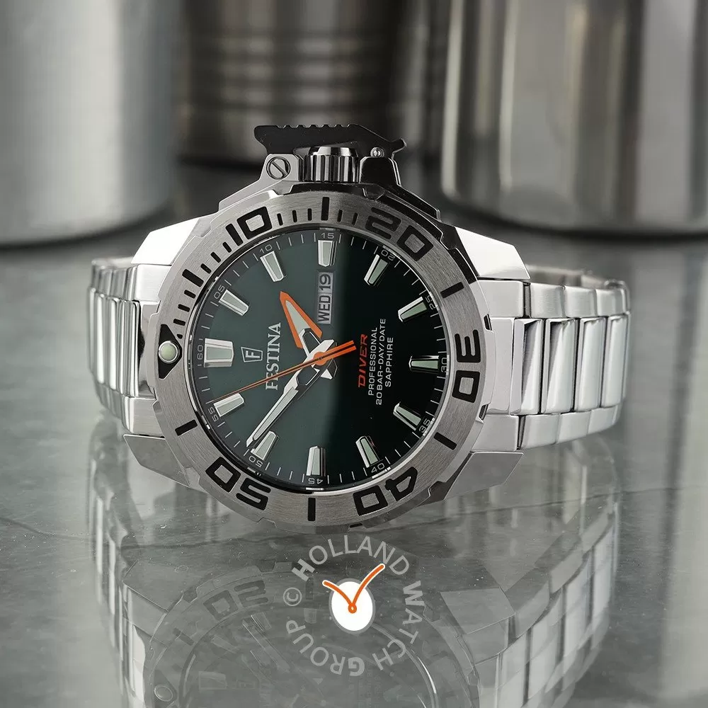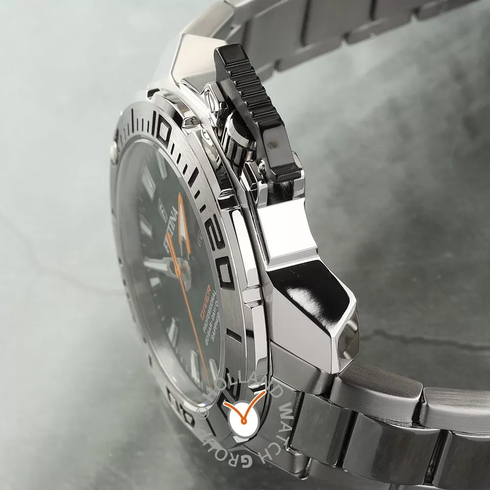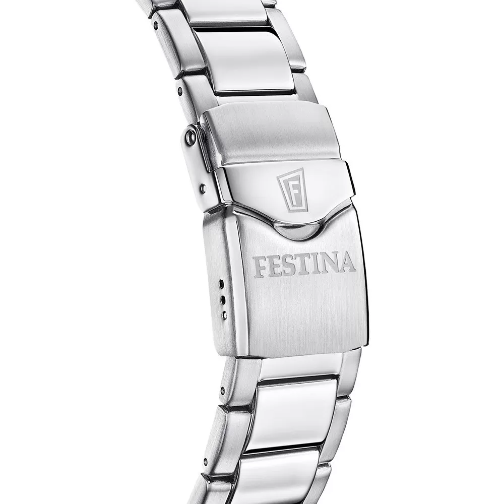 This Festina watch has a case made of stainless steel with a diameter of 46 mm and is fitted with a metal band. Inside the case lies a Miyota movement and the watch features a Sapphire crystal.