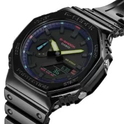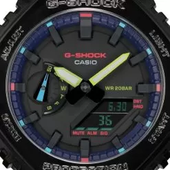 This G-Shock watch has a carbon case 45.4 mm in diameter and is fitted with a plastic / resin strap. Inside the case lies a Casio movement and the watch features a Mineral crystal.