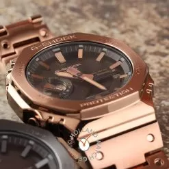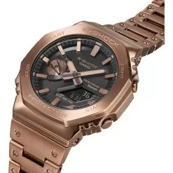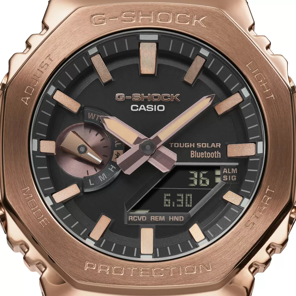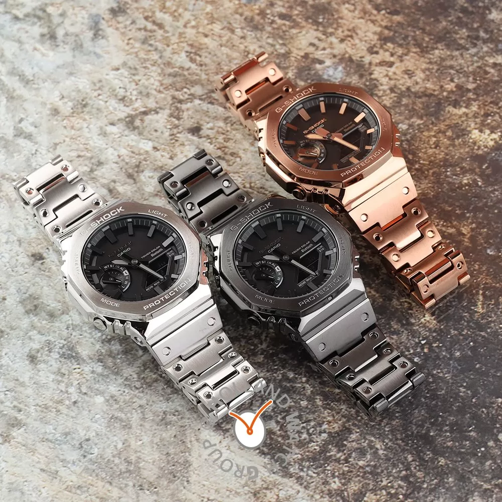 This G-Shock watch has a stainless steel case 44.4 mm in diameter and is fitted with a metal strap. Inside the case lies a Casio movement and the watch features a Mineral crystal.
