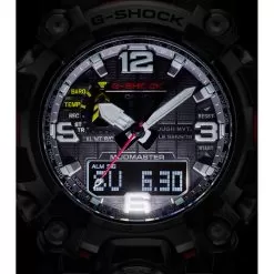 This G-Shock watch has a carbon case 54.4 mm in diameter and is fitted with a plastic / resin strap. Inside the case lies a Casio movement and the watch features a Mineral crystal.