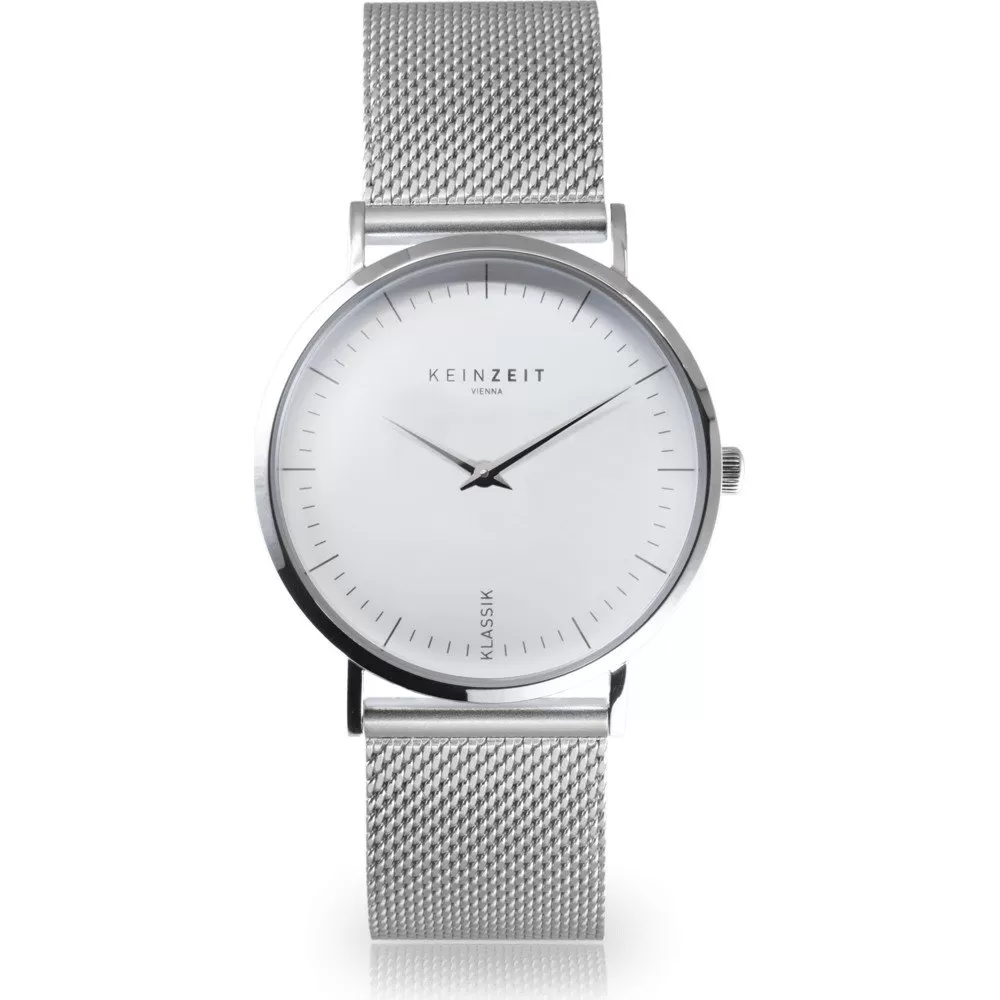 This Keinzeit watch has a case made of stainless steel with a diameter of 36 mm and is fitted with a metal band. Inside the case lies a Miyota movement and the watch features a Sapphire coated mineral crystal.