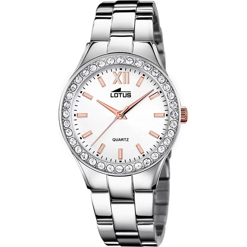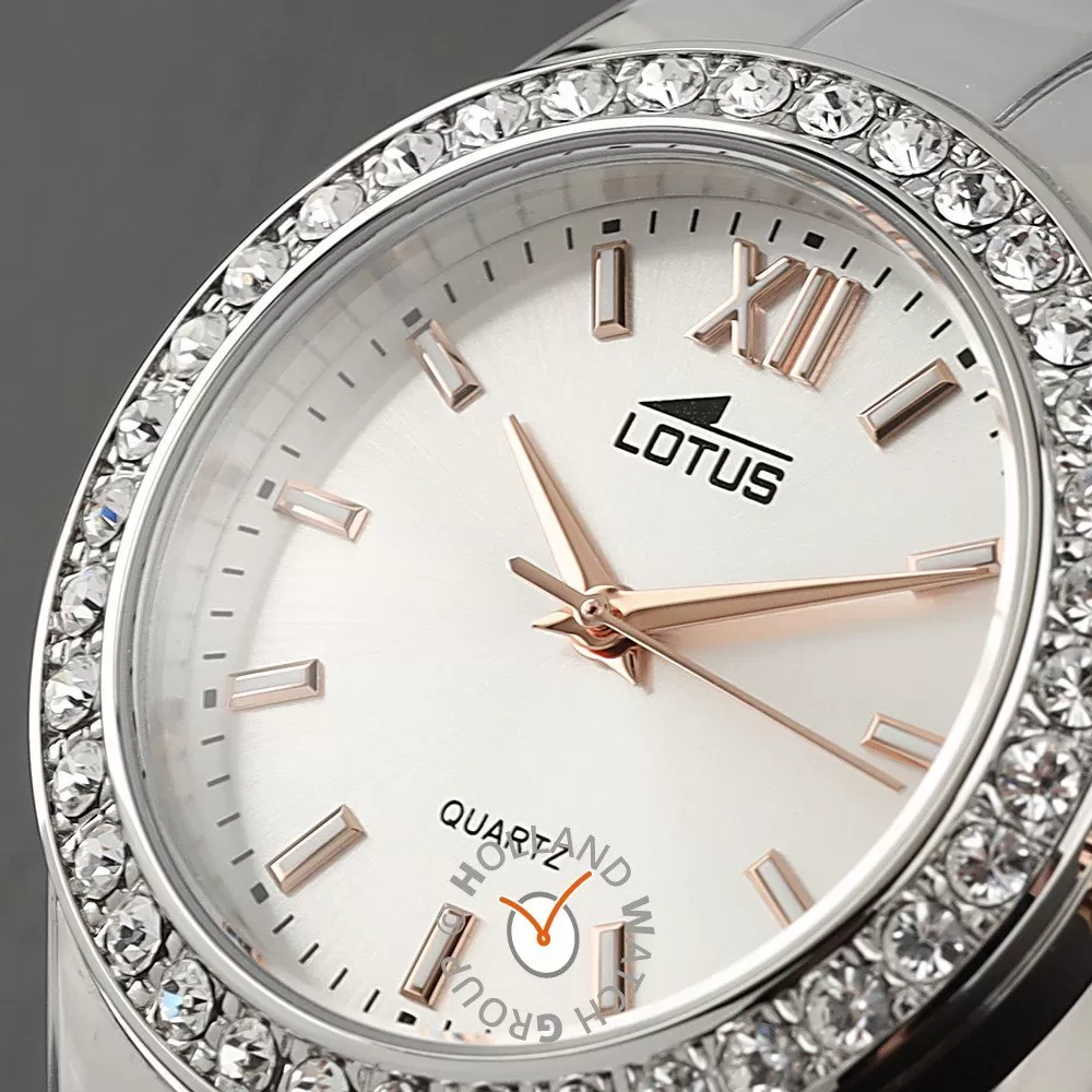 This Lotus watch has a case made of stainless steel with a diameter of 32 mm and is fitted with a metal band. Inside the case lies a Miyota movement and the watch features a Mineral crystal.