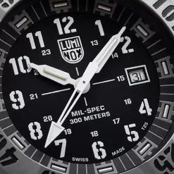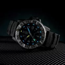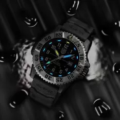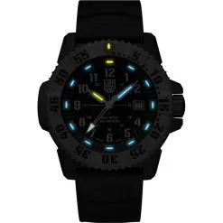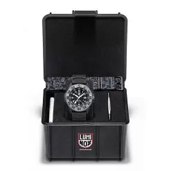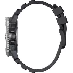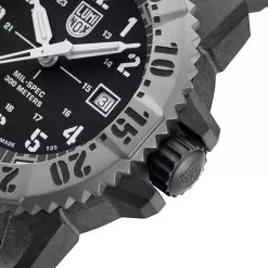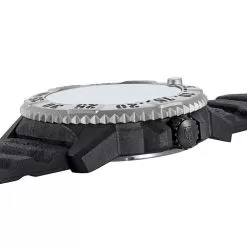 This Luminox watch has a case made of carbon with a diameter of 46 mm and is fitted with a rubber band. Inside the case lies a ETA movement and the watch features a Single anti-reflective sapphire crystal.