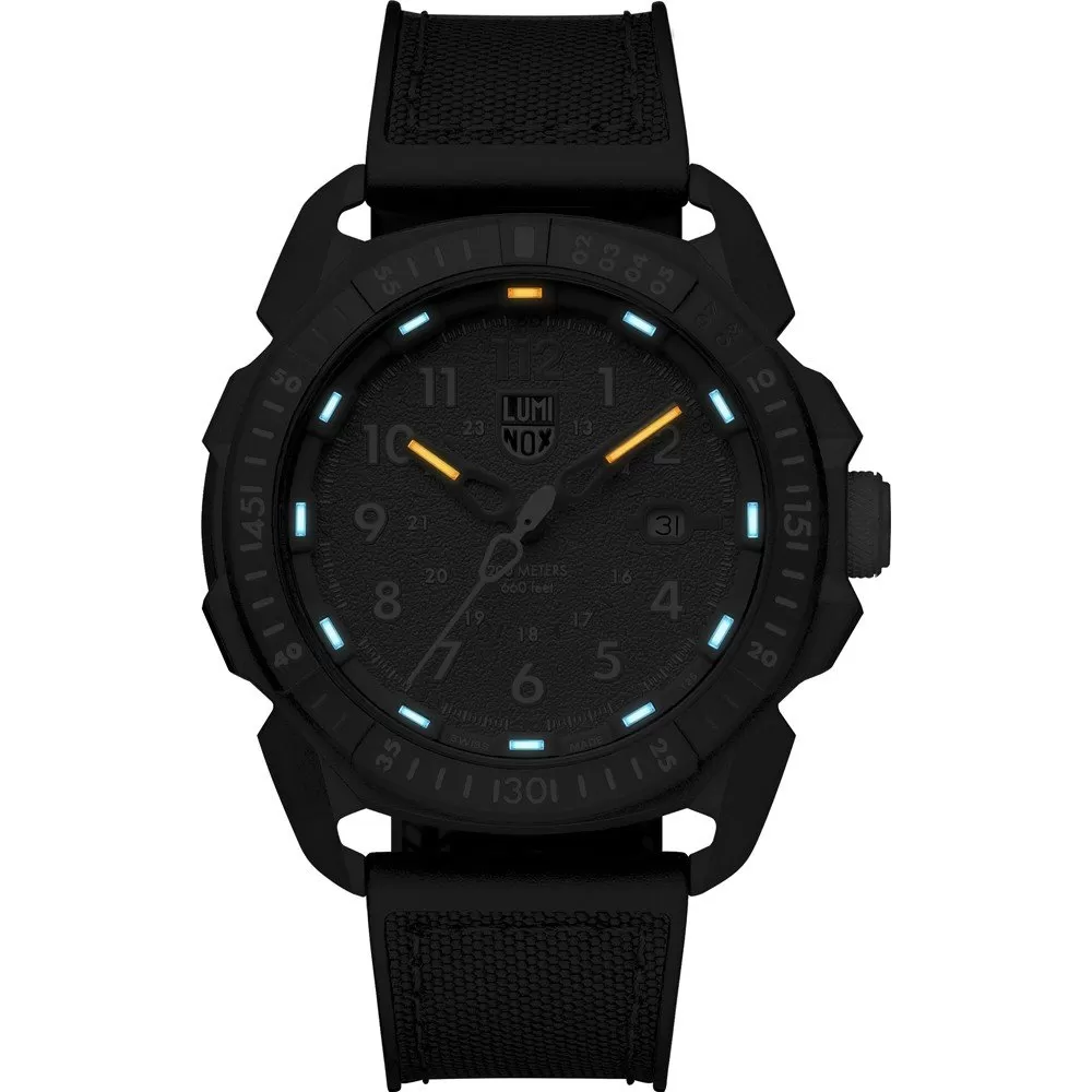 This Luminox watch has a case made of carbon with a diameter of 46 mm and is fitted with a rubber band. Inside the case lies a Ronda movement and the watch features a Single anti-reflective sapphire crystal.
