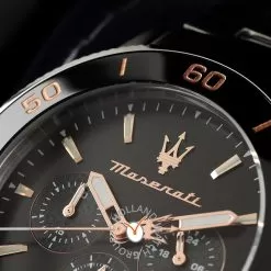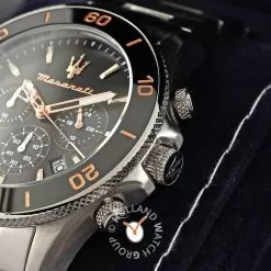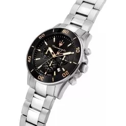 This Maserati watch has a case made of stainless steel with a diameter of 43 mm and is fitted with a metal band. Inside the case lies a Miyota movement and the watch features a Mineral crystal.