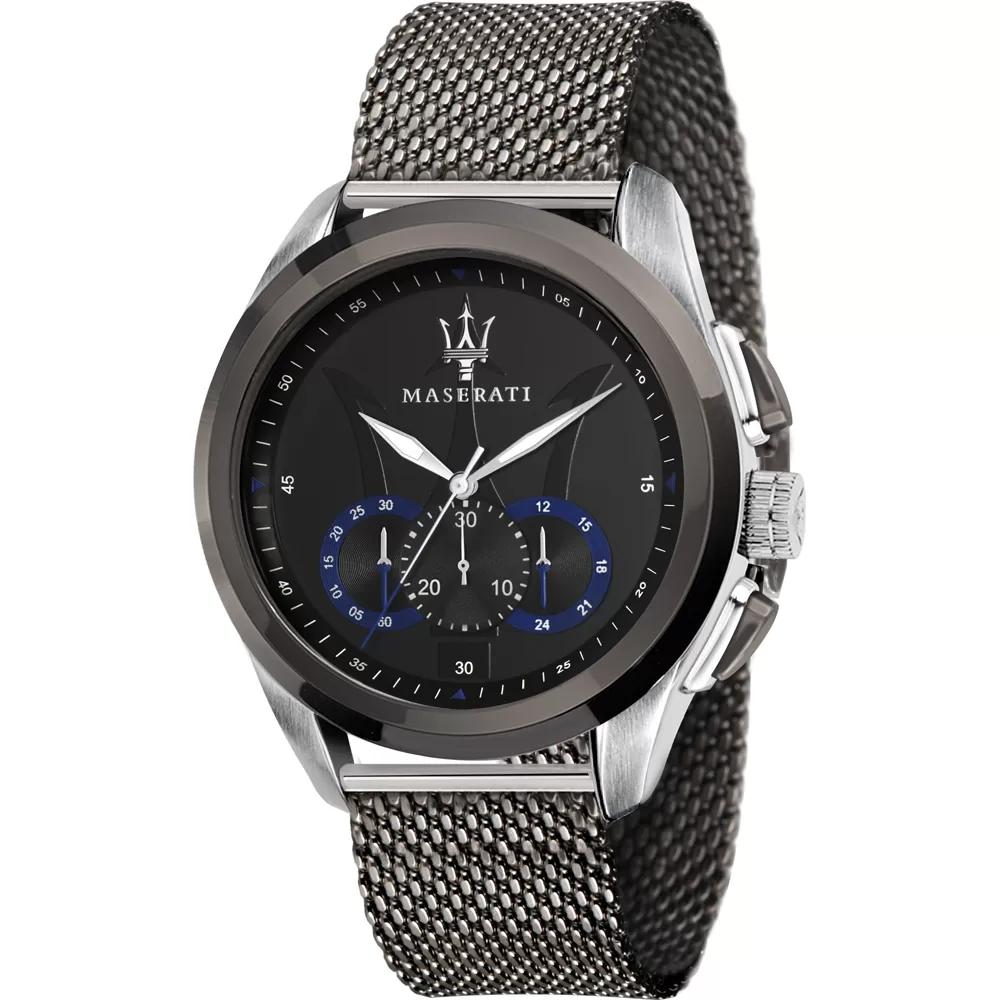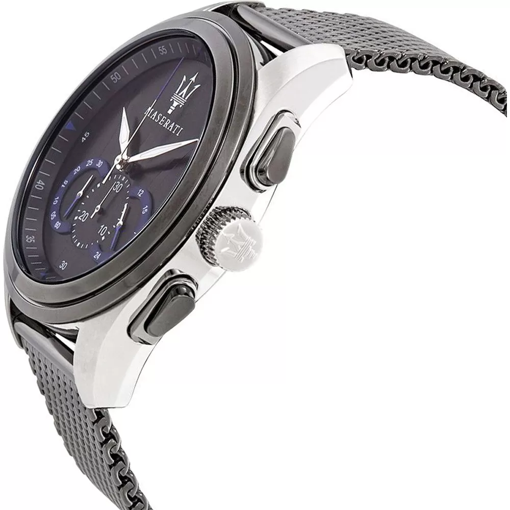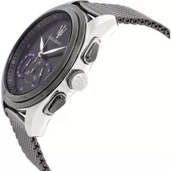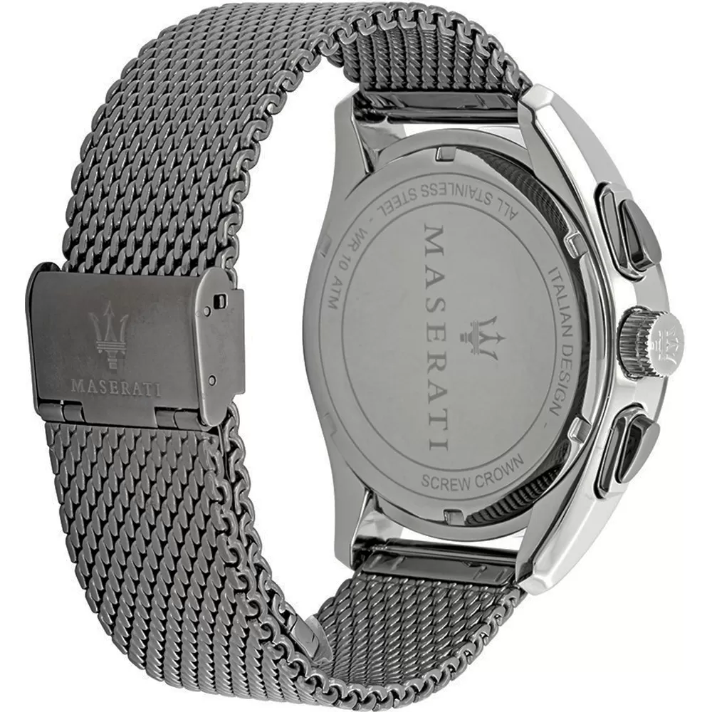 This Maserati watch has a case made of stainless steel with a diameter of 45 mm and is fitted with a metal band. Inside the case lies a Miyota movement and the watch features a Mineral crystal.