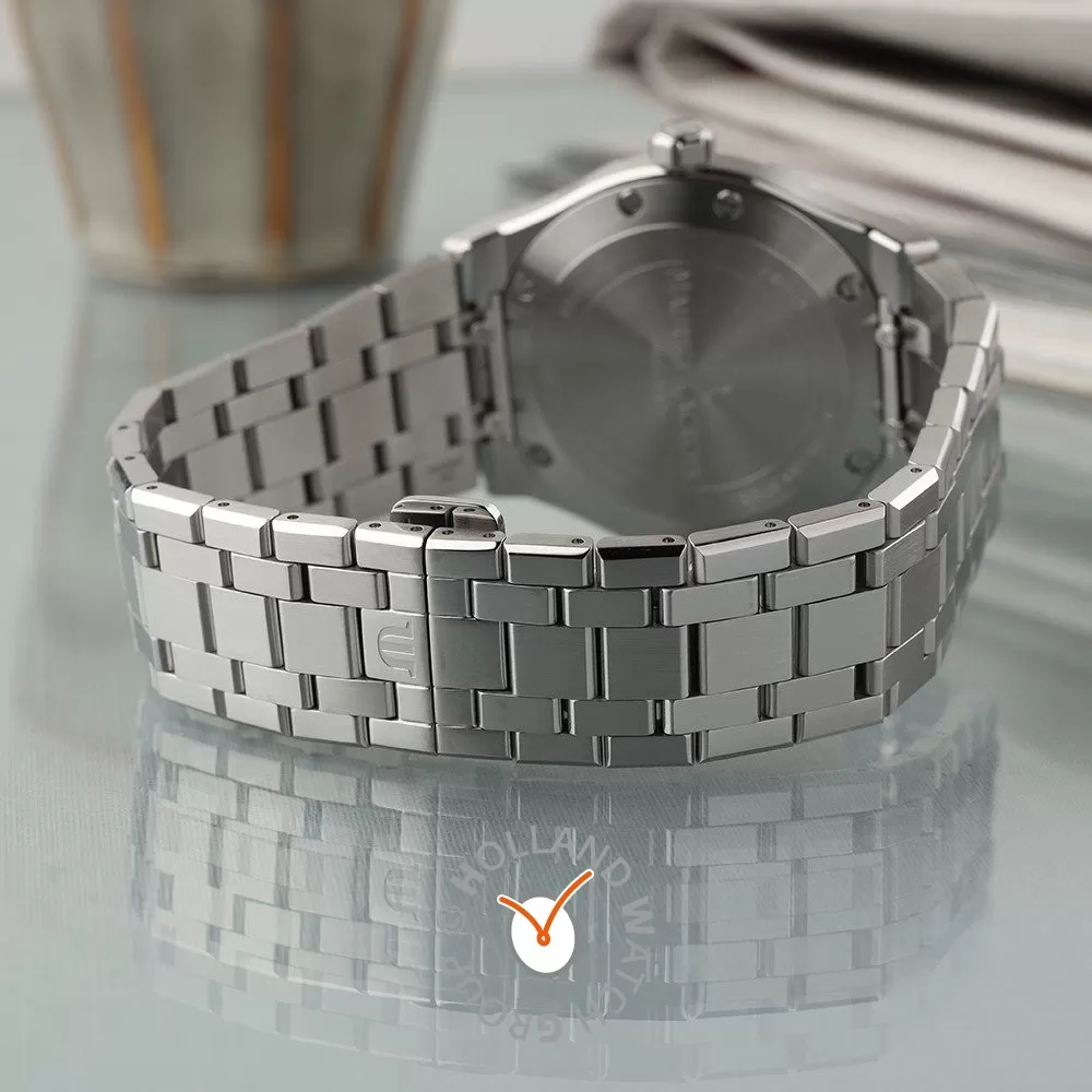 This Maurice Lacroix watch has a case made of stainless steel with a diameter of 40 mm and is fitted with a metal band. Inside the case lies a Ronda movement and the watch features a Sapphire crystal.