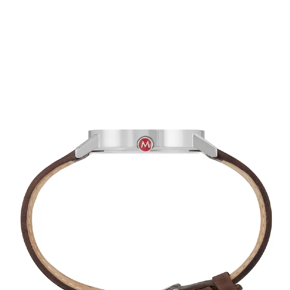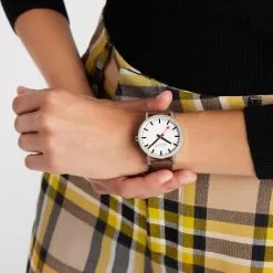 This Mondaine watch has a case made of stainless steel with a diameter of 40 mm and is fitted with a leather band. Inside the case lies a Ronda movement and the watch features a Mineral crystal.