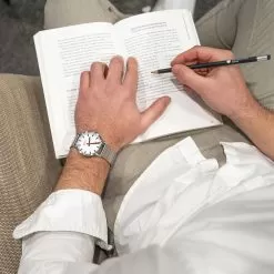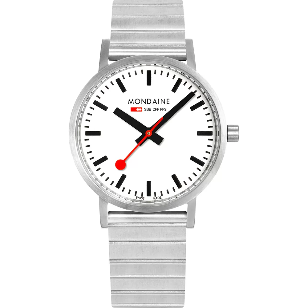 This Mondaine watch has a case made of stainless steel with a diameter of 40 mm and is fitted with a metal band. Inside the case lies a Ronda movement and the watch features a Mineral crystal.