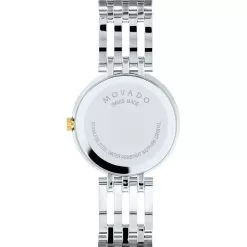 This Movado watch has a case made of stainless steel with a diameter of 28 mm and is fitted with a metal band. Inside the case lies a ETA movement and the watch features a Sapphire crystal.