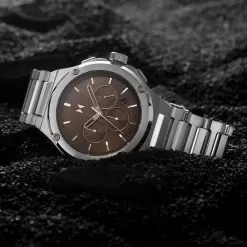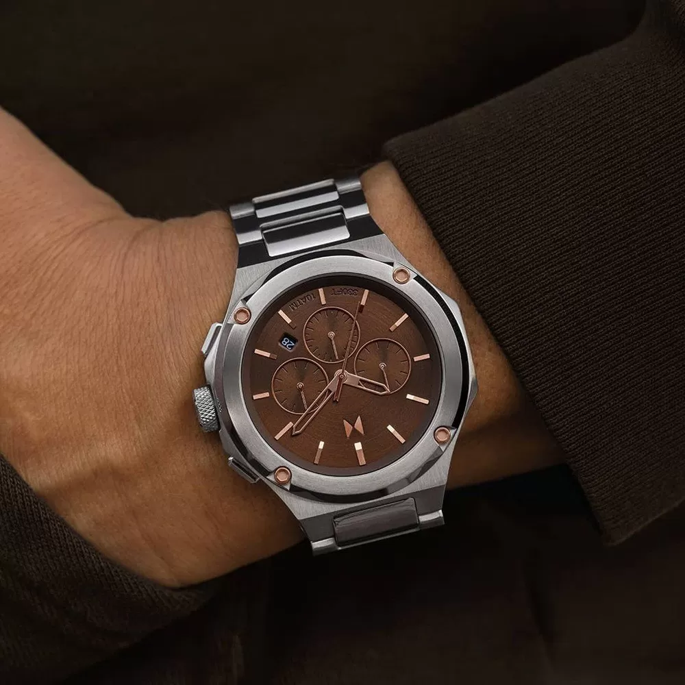 This MVMT watch has a case made of stainless steel with a diameter of 46.5 mm and is fitted with a metal band. Inside the case lies a Seiko Instruments Inc. movement and the watch features a Mineral crystal.