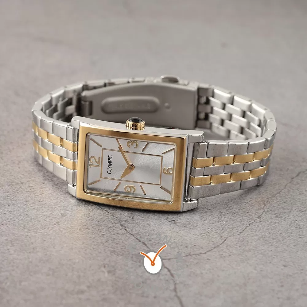 This Olympic watch has a case made of stainless steel with a diameter of 21 mm and is fitted with a metal band. Inside the case lies a Miyota movement and the watch features a Mineral crystal.