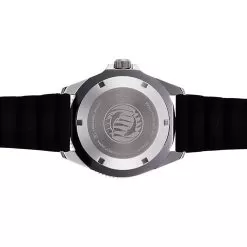 This Orient watch has a stainless steel case 44 mm in diameter and is fitted with a rubber strap. Inside the case lies a Orient movement and the watch features a Mineral crystal.