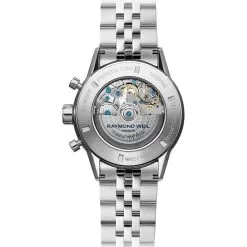 This Raymond Weil watch has a case made of stainless steel with a diameter of 43.5 mm and is fitted with a metal band. Inside the case lies a Sellita movement and the watch features a Sapphire crystal.