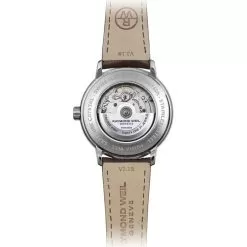 This Raymond Weil watch has a case made of stainless steel with a diameter of 39 mm and is fitted with a leather band.