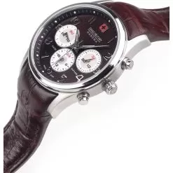 This Swiss Military Hanowa watch has a case made of stainless steel with a diameter of 36 mm and is fitted with a leather band. Inside the case lies a ISA movement and the watch features a Sapphire crystal.