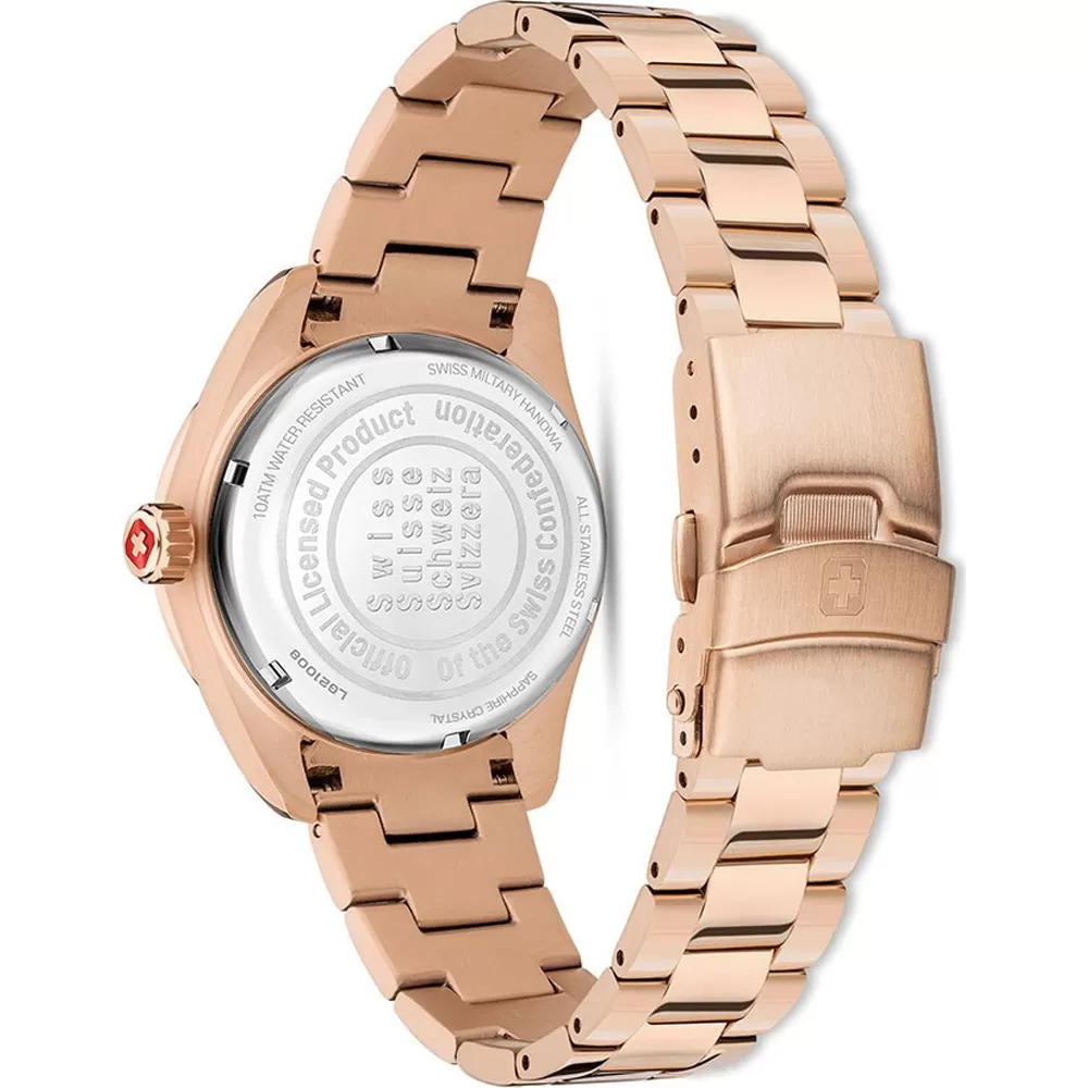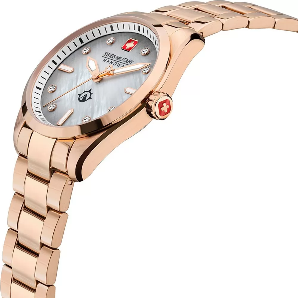 This Swiss Military Hanowa watch has a case made of stainless steel with a diameter of 37 mm and is fitted with a metal band. Inside the case lies a Ronda movement and the watch features a Sapphire crystal.