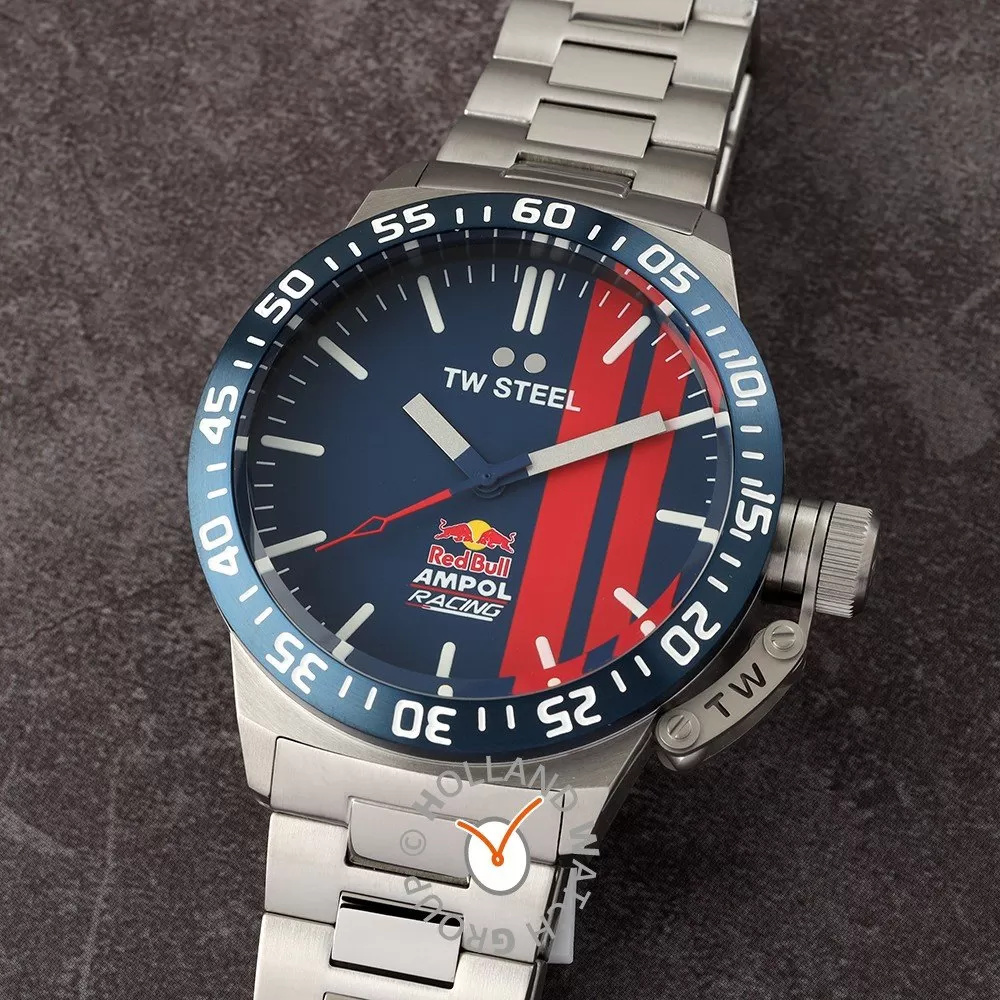 This TW Steel watch has a case made of stainless steel with a diameter of 45 mm and is fitted with a metal band. Inside the case lies a Miyota movement and the watch features a Hardened mineral crystal.
