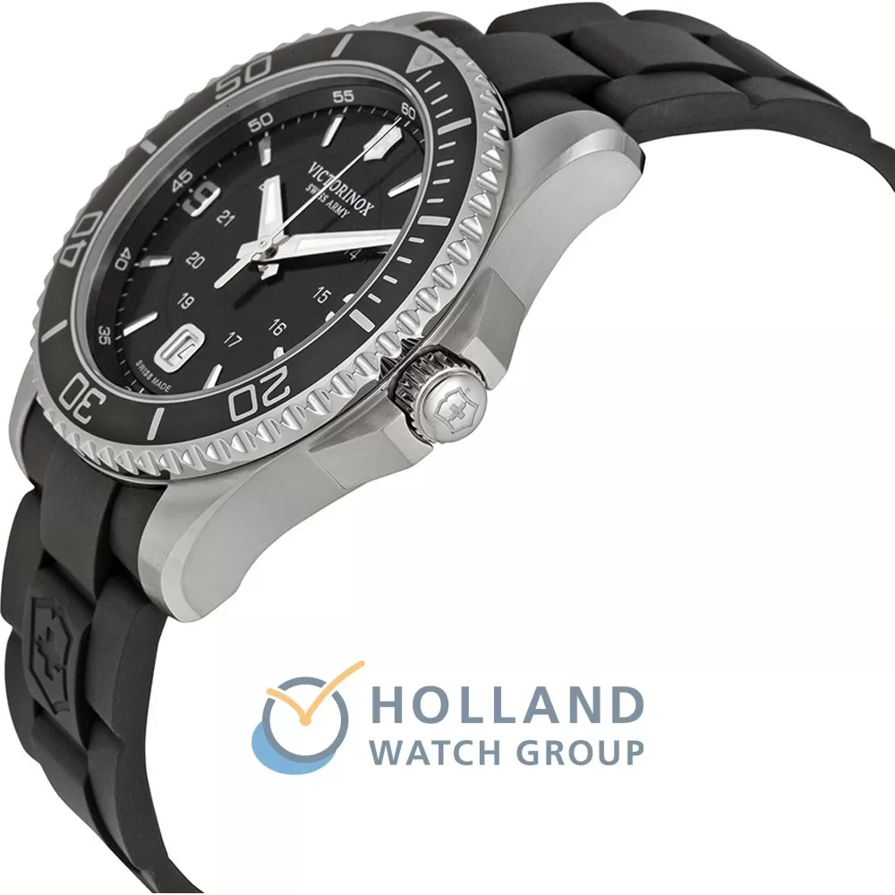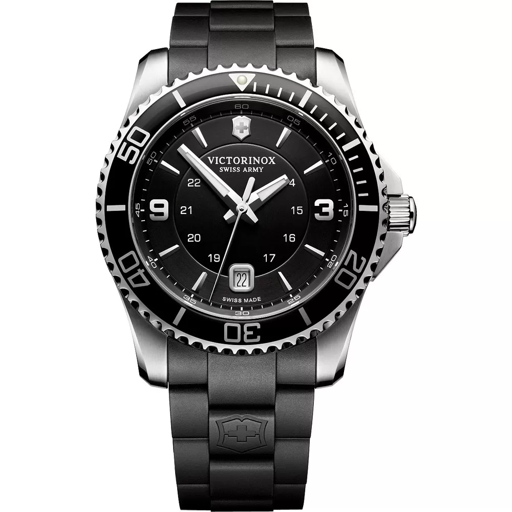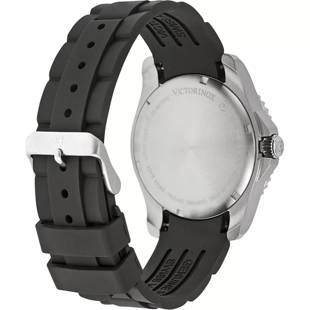 This Victorinox Swiss Army watch has a case made of stainless steel with a diameter of 43 mm and is fitted with a rubber band. Inside the case lies a Ronda movement and the watch features a Sapphire crystal.